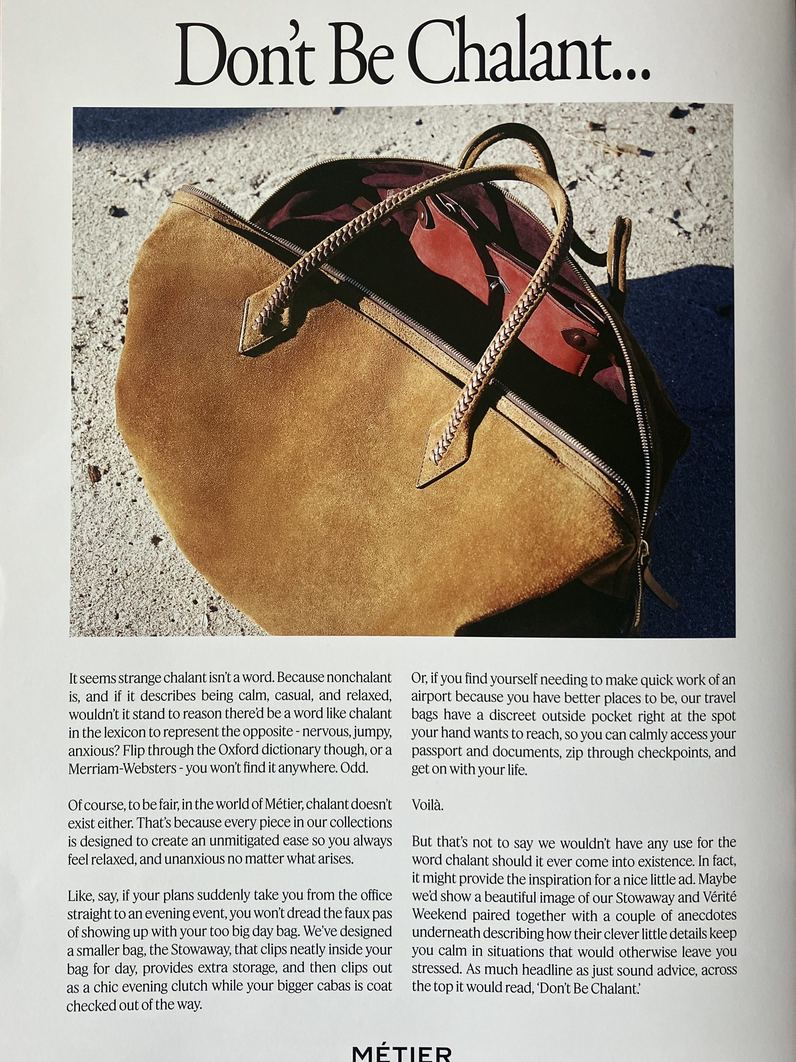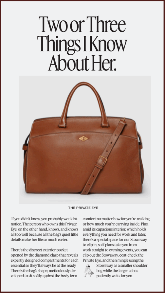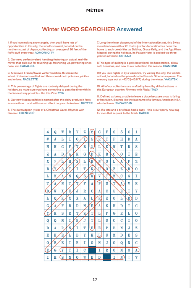 Creative Director and Writer of Bi-Annual Magazine for the luxury handbag line. Among the written content; a word search, a corny jokes section called ‘knee slappers,’ and ads channeling the old Apple ones from the 80’s: